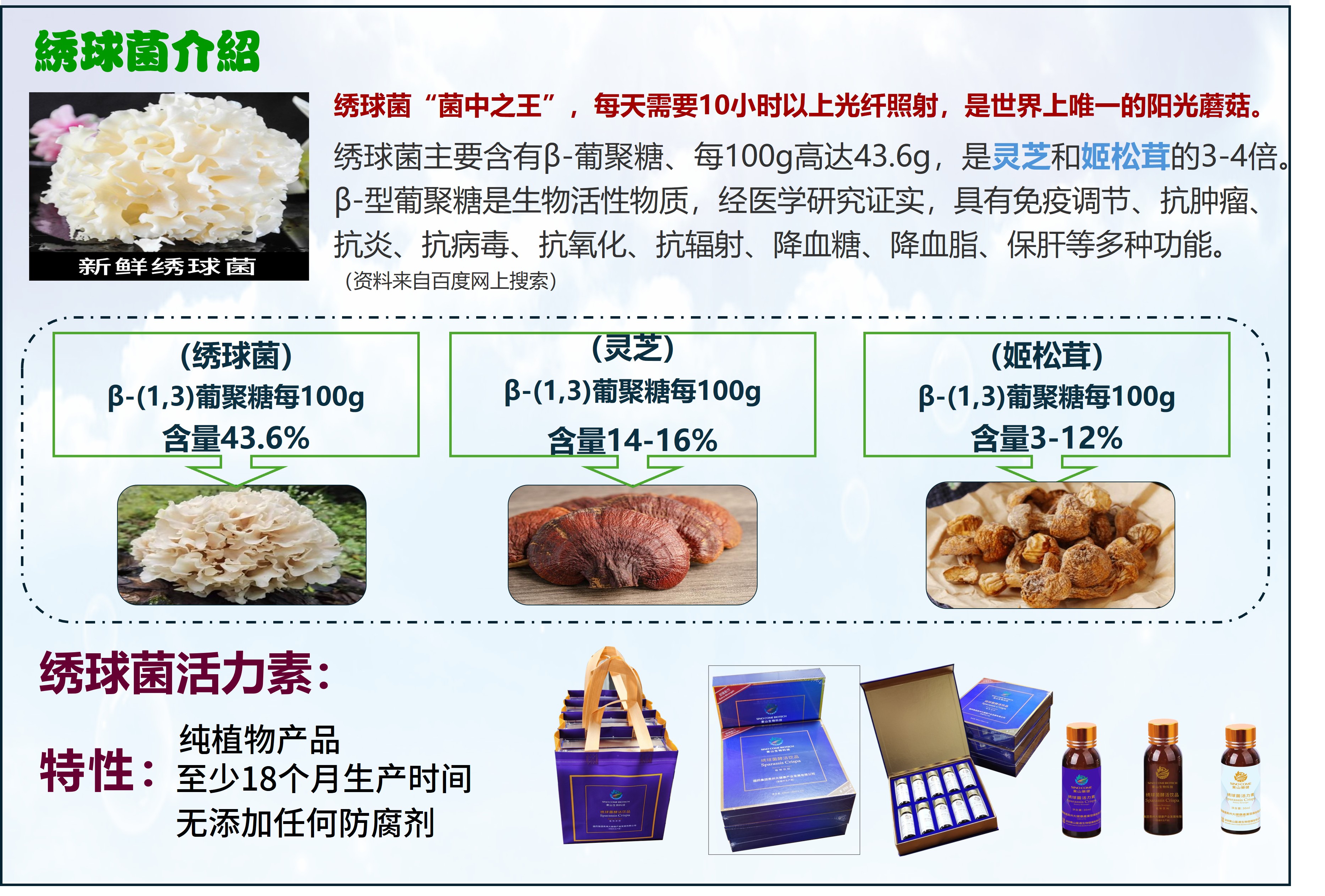 我们的 "绣球菌活力素"健康产品,以珍贵的绣球菌为核心原料。